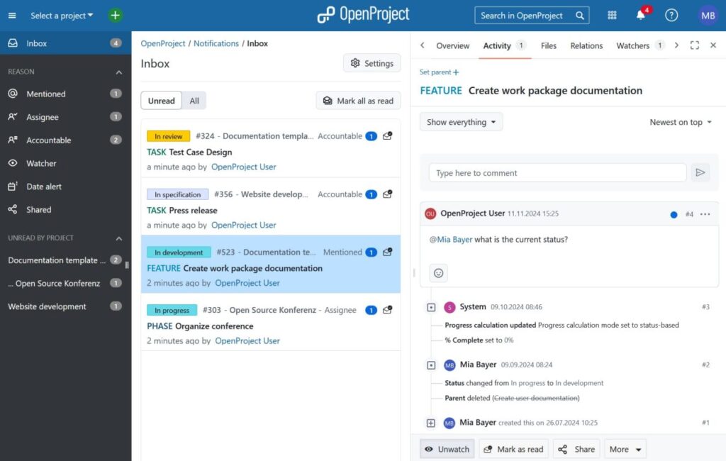OpenProject also shines in its versatility. You can manage projects using classic, agile, or hybrid methods. Its visual tools – Gantt charts, Kanban boards, and team planners – make it easy to schedule tasks, assign workloads, and track progress at a glance. The platform helps teams stay on top of deadlines, collaborate efficiently, and maintain clarity on responsibilities, even in complex projects.