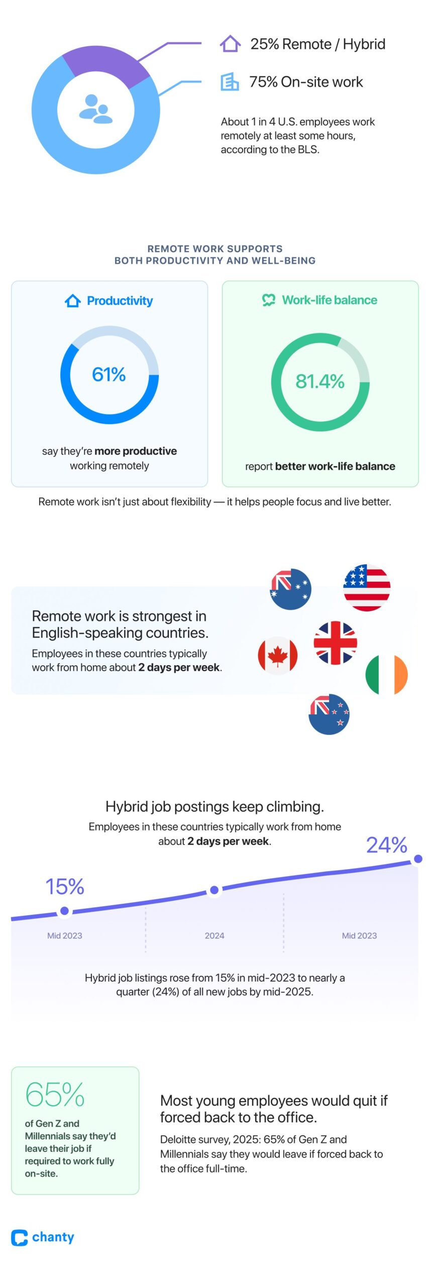 - Aproximadamente 1 de cada 4 empleados en EE. UU. trabaja en remoto al menos algunas horas, según la Oficina de Estadísticas Laborales (BLS).