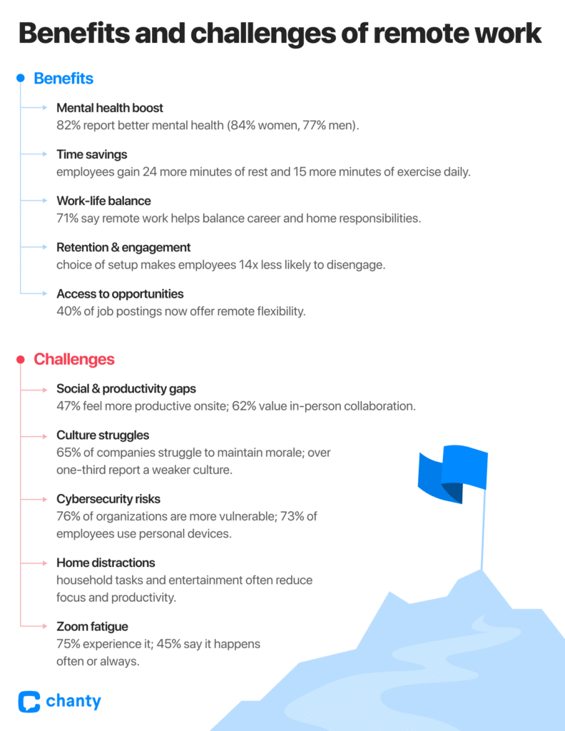 Los beneficios son reales. La flexibilidad permite a las personas controlar sus horarios, equilibrar responsabilidades y trabajar desde cualquier lugar. Las estadísticas sobre el trabajo desde casa muestran que los empleados suelen experimentar mayor productividad y un mejor equilibrio entre vida personal y laboral cuando cuentan con esta libertad.