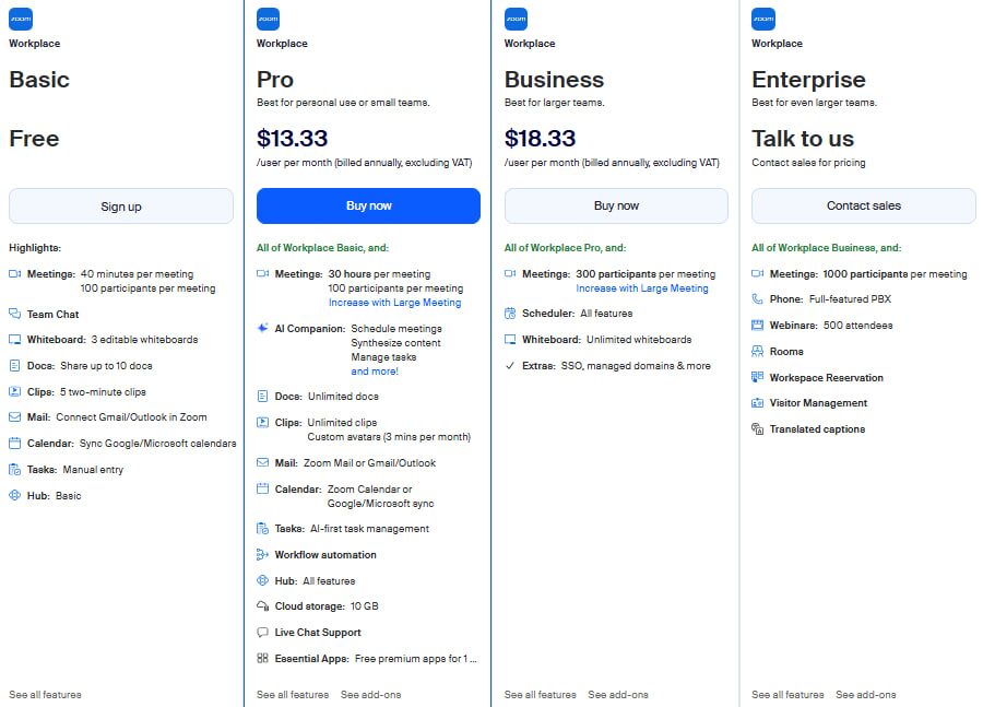 Pro Plan: $13.33/month/user (billed annually) removes the 40-minute limit on group meetings, allows up to 5 GB of cloud storage, and includes user management tools, AI Companion, Zoom Docs, Clips Plus, Mail & Calendar integration, and Whiteboard access.