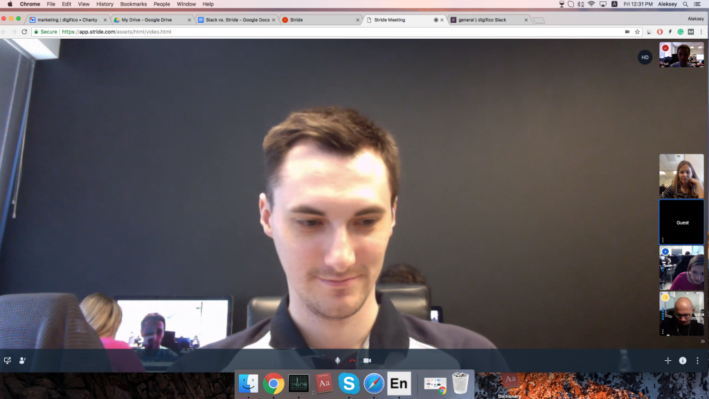 In Slack we could talk only 1-1. So it wasn’t that much fun, I guess. Of course, we could add Google Hangout or another video app, but decided to stick to in-built tools. My video didn’t work, but we are pretty sure it’s because of some local issues – there was nothing wrong with Slack.