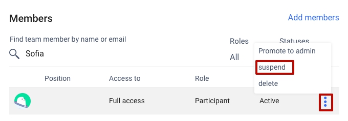 Note: Currently, suspending team members is available from browser and desktop apps. The team space creator is the only person on a team who can suspend other members.