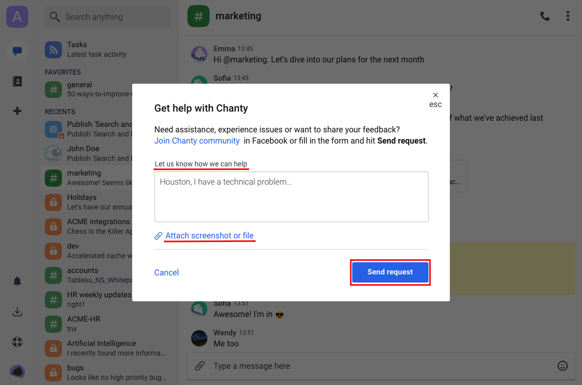 Sugerencia: Puedes unirte a la comunidad de Chanty para recibir la información más reciente, anuncios acerca de nuevas funciones, dejar comentarios y discutir acerca del uso de Chanty con el resto de los miembros de la comunidad.