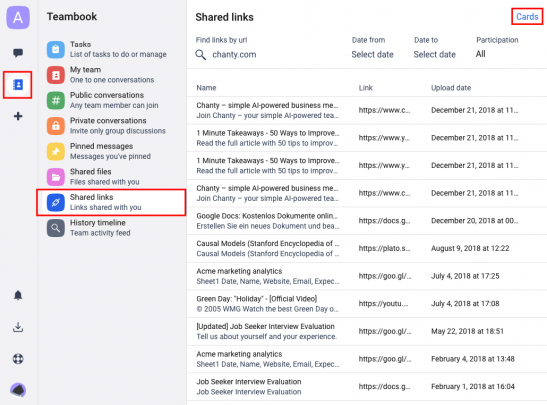 Ve a la pestaña de Enlaces compartidos dentro del Libro de equipo, luego ingresa las palabras claves para comenzar la búsqueda en el menú de Enlaces compartidos.