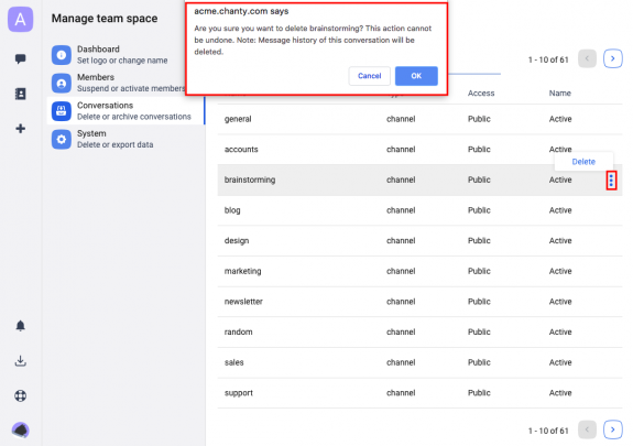 - Confirma la eliminación del canal desde la ventana emergente haciendo clic en Eliminar o, si cambias de parecer, haz clic en Cancelar si no deseas eliminar el canal.